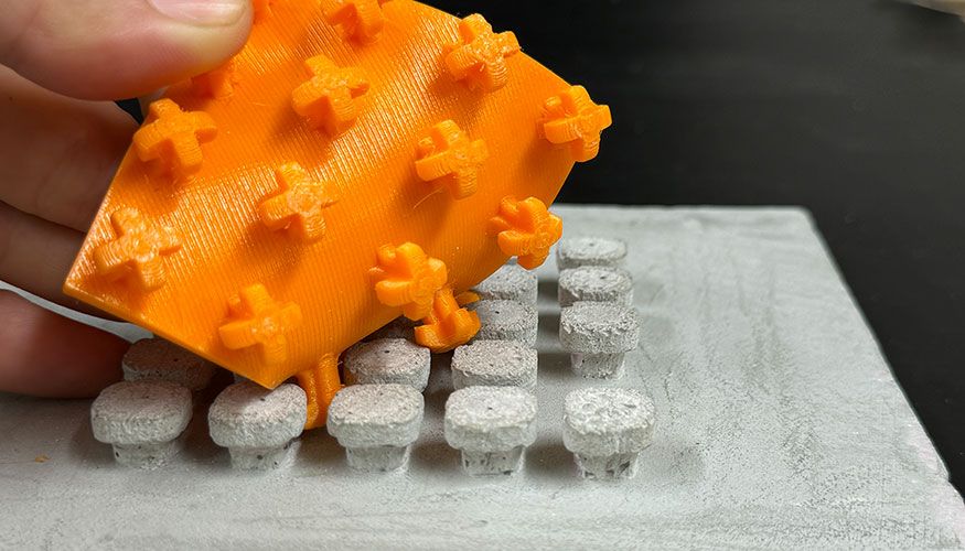 Das entwickelte System mit Klettkomponenten aus Rohbaustoffen funktioniert wie ein Klettverschluss – nur in etwas größerer Dimension. An den zu verbindenden Enden der Bauteile befinden sich direkt eingearbeitete Pilzköpfe oder Haken, die sich auf der entgegengesetzten Seite in ein (eigens mittels 3D-Druck hergestelltes) Klettelement verhaken und damit fest verbinden. Die im Projekt entwickelten Verbindungssysteme zeigten bei Tests im Labor für konstruktiven Ingenieurbau der TU Graz eine gute Haftzugfestigkeit, die mit industriellen Produkten vergleichbar ist.