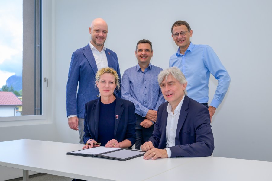 V.l.n.r. hinten: Malte Debus, CFO Telekom HealthCare Solutions, Johannes Fellner, CFO synedra IT GmbH, Stefan Andreatta, CEO synedra IT GmbH, vorne: Janine Haschke, Geschäftsführerin Telekom Healthcare Solutions, Thomas Pellizzari, Geschäftsführer / CEO bei akedis Innovations © Deutsche Telekom