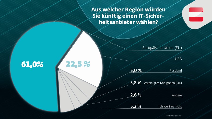 Immer mehr österreichische Unternehmen wollen sich digital unabhängig machen und setzen dabei auf europäische IT-Sicherheitslösungen. Das zeigt eine neue repräsentative B2B-Umfrage des europäischen IT-Sicherheitsherstellers ESET. Vor dem Hintergrund geopolitischer Spannungen, wachsender Cyberbedrohungen und schärferer gesetzlicher Anforderungen gewinnt die Herkunft von IT-Sicherheitslösungen massiv an Bedeutung.