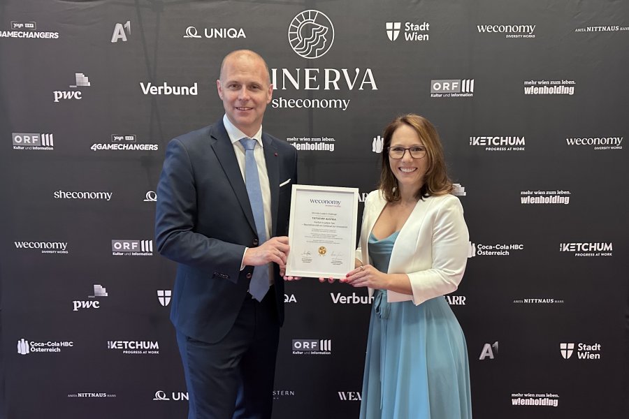 v.l.n.r.: Robert Kaup (Managing Director Tietoevry Austria und Head of New Markets bei Tietoevry Create) und Cornelia Samec (Operations Lead New Markets und DEI Lead Austria bei Tietoevry Create) mit der Urkunde für den Minerva-Award 2025 © Tietoevry