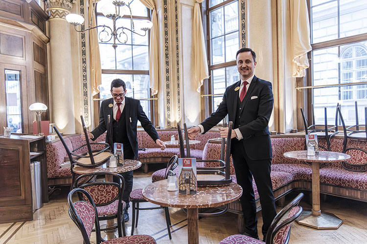 Ein wesentlicher Bestandteil ist die behutsame Restaurierung der historischen Substanz. Thonet-Stühle werden aufgearbeitet, Stoffe des Traditionsunternehmens Backhausen erneuert oder originalgetreu nachgefertigt, historische Luster durch spezialisierte Werkstätten restauriert. Wo Elemente aus den 1980er-Jahren nicht mehr dem historischen Erscheinungsbild entsprechen oder technisch überholt sind, werden sie sensibel ersetzt.