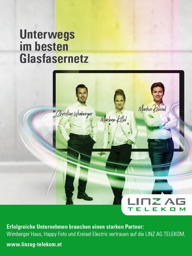 Unterwegs im besten Glasfasernetz Erfolgreiche Unternehmen brauchen einen starken Partner: Wimberger Haus, Happy Foto und Kreisel Electric vertrauen auf die LINZ AG TELEKOM. www.linzag-telekom.at