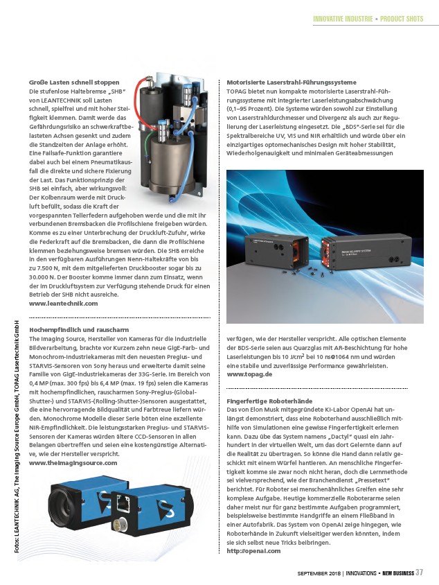 The AG,LEANTECHNIK Fotos:SEPTEMBER 2018 | INNOVATIONS • NEW BUSINESS 37 Motorisierte Laserstrahl-Führungssysteme