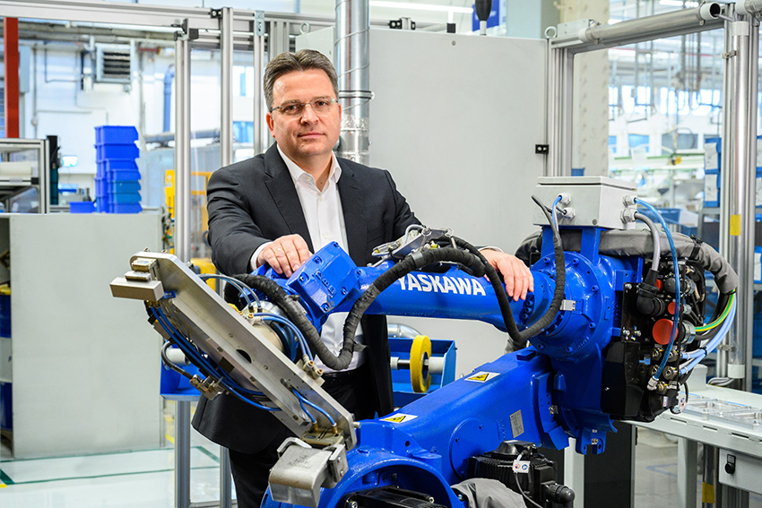Knorr-Bremse Geschäftsführer Dkfm. Jörg Branschädel investiert in die Automatisierung der Produktion und präsentiert einen der Roboter für die Fertigung von Magnetschienenbremsen für Schienenfahrzeuge. © Gregor Nesvadba