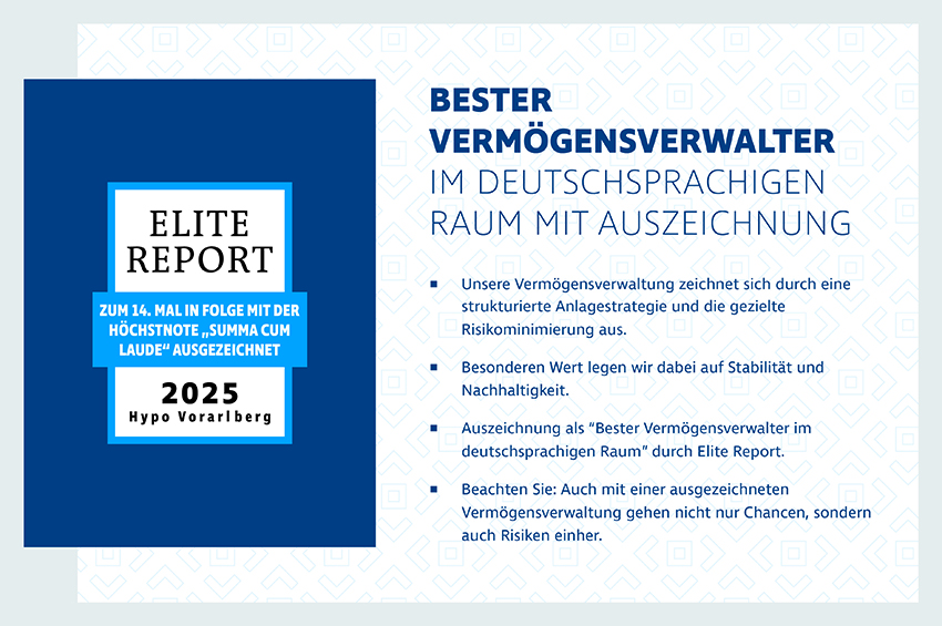 Forster: Abwarten ist keine Option. Wer sein Vermögen schützen und entwickeln möchte, muss aktiv werden. Ich bin überzeugt, dass wir künftig noch stärker auf Nachhaltigkeit, Flexibilität und grenzüberschreitende Diversifikation setzen werden. Die Hypo Vorarlberg bietet dafür die ideale Plattform – regional verwurzelt und gleichzeitig international ausgerichtet. Wie immer muss man beachten, dass Veranlagungen in Finanzinstrumente mit Risiken verbunden und Kursschwankungen sowie -verluste möglich sind. (PR)