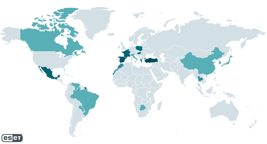 ESET konnte die Spur von CosmicBeetle und ihren Werkzeugen weltweit nachverfolgen. Besonders betroffen sind Länder der Europäischen Union, beispielsweise Spanien, Frankreich, Belgien, Polen und Ungarn. Außerhalb der EU werden vor allem Organisationen in Mexiko und der Türkei zum Ziel.