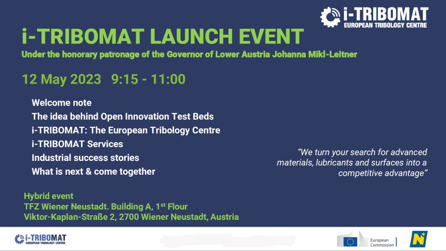 Am 12. Mai von 9:30 bis 12:00 findet die offizielle Eröffnungsfeier der i-TRIBOMAT GmbH unter der Patronanz von Landeshauptfrau Johanna Mikl-Leitner statt. Der Event findet im TFZ Wiener Neustadt, Viktor-Kaplan-Straße 2 statt.