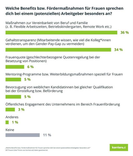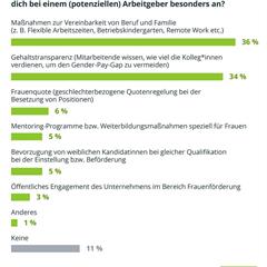 Die Gehaltstransparenz zur Vermeidung einer ungleichen Bezahlung von Männern und Frauen (Gender-Pay-Gap) ist für 34 Prozent der Arbeitnehmerinnen die ansprechendste Maßnahme zur Frauenförderung vonseiten der Arbeitgeber, gleich hinter Maßnahmen zur Vereinbarkeit von Beruf und Familie (36 Prozent). Die sogenannte „Frauenquote“ sowie die Bevorzugung von weiblichen Kandidatinnen bei gleicher Qualifikation sind demgegenüber deutlich weniger beliebt.