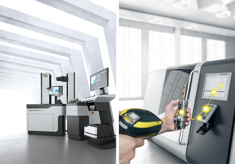 Li.: „redomatic“ sind die universellen Einstell- und Messgeräte mit integrierter Schrumpftechnologie. Re.: Mit „zidCode 4.0“ werden sämtliche digitalen Werkzeugdaten an die CNC-Steuerung übertragen. © ZOLLER Austria GmbH