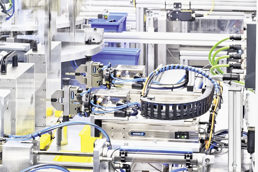 Zudem wurde die ohnehin schon große Schrägzugfläche des Keilhakenantriebs beim PGN-plus-P noch weiter vergrößert, wodurch auch hier der Verschleiß sinkt und die Prozesssicherheit profitiert. Selbst wenn die Leistungsgrenze wie in der Anlage bei ABUS nicht angetastet wird, zahlt sich die Leistungsreserve aus: Auch unter Normalbelastung minimiert die neue Konstruktion des SCHUNK-Megasellers den Verschleiß und erhöht die Lebensdauer. Hinzu kommt, dass umlaufende Schmierstofftaschen an der Vielzahnführung des PGN-plus-P dafür sorgen, dass die Gleitflächen kontinuierlich benetzt werden und der Greifer unter normalen, sauberen Einsatzbedingungen lebenslang wartungsfrei arbeitet. Zyklenzahlen im mittleren siebenstelligen Bereich sind mit dem SCHUNK PGN-plus-P keine Seltenheit.