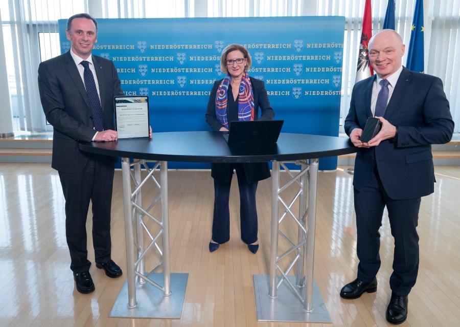 v.li.n.re.: Wirtschaftslandesrat Jochen Danninger, Landeshauptfrau Johanna Mikl-Leitner, ecoplus Geschäftsführer Helmut Miernicki © NLK Filzwieser