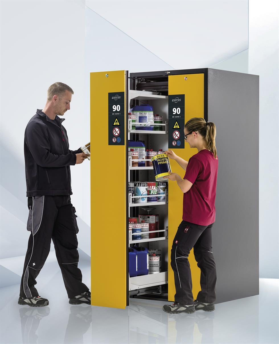 Ein elektronischer Temperatursensor aktiviert im Brandfall das Schließen der Vertikalauszüge. So bietet der neue Gefahrstoffschrank geprüfte 90 Minuten Brandschutz nach ÖNORM EN 14470-1.