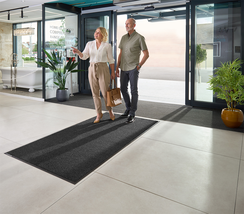 „Die Outdoormatten sind die erste Barriere, die dafür sorgt, dass die groben Schmutzpartikel draußen bleiben. Diese Matten sind dabei nicht nur funktional, sondern bieten auch optisch ansprechende Designs, die den Eingangsbereich aufwerten“, erklärt Fleischanderl. Im anschließenden Indoorbereich kommen zuerst die Premiummatten zum Einsatz. Diese nehmen den feineren Schmutz und die Feuchtigkeit auf, die nach dem Betreten des Gebäudes noch an den Schuhen haften. „Die Premiummatten spielen eine entscheidende Rolle, um den Innenbereich sauber und trocken zu halten. Sie zeichnen sich durch ihre hohe Saugfähigkeit und Langlebigkeit aus, was sie besonders für Eingangsbereiche mit hohem Besucheraufkommen geeignet macht. Sie vermindern die Rutschgefahr und sorgen für einen sicheren Auftritt für Gäste und Mitarbeiter“, so Fleischanderl.