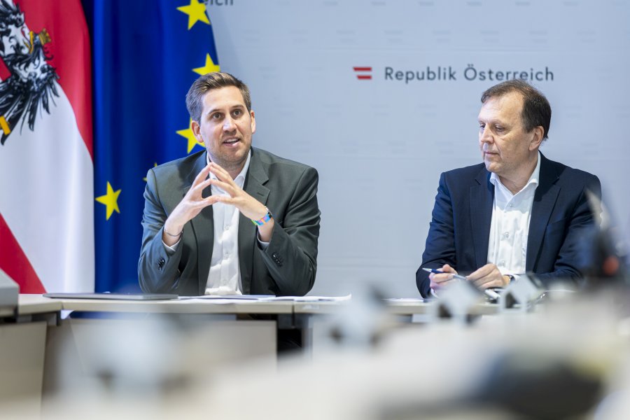Staatssekretär Pröll (li.) und BRZ-GF Ledinger (re.) beim Pressegespräch. Horst Bischof (nicht im Bild), Rektor der TU Graz, wurde digital zugeschaltet. © BKA/Florian Schrötter